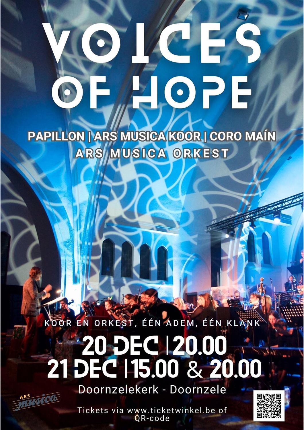 Het Ars Musica Orkest o.l.v. Dominiek Reynaert begeleidt de zangers van drie koren - Coro Maín, Papillon en het Ars Musica Koor en dompelen samen de Doornzelekerk onder in een warme gloed. De bijzondere akoestiek en sfeervolle belichting (in professionele handen van Argon AV) maken van Voices of Hope een totaalervaring waarin muziek, emotie en samenspel centraal staan.